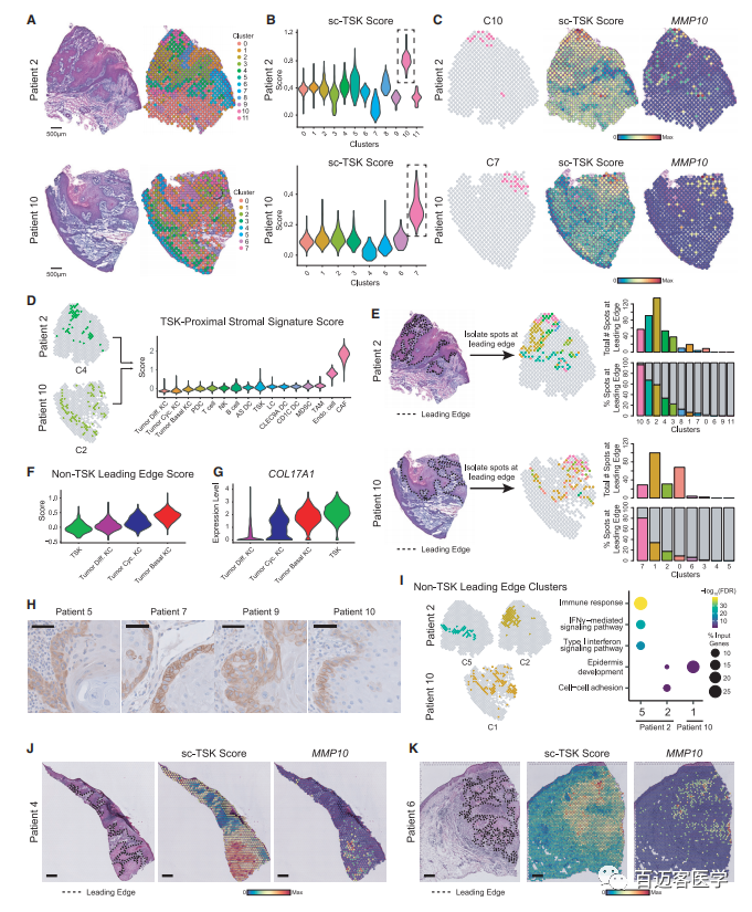 在患者中,腫瘤相關(guān)的斑點(diǎn)簇展現(xiàn)出單細(xì)胞測(cè)序腫瘤KCs的定位基因表達(dá),同時(shí)免疫或間質(zhì)基因與腫瘤臨近間質(zhì)、未受累的間質(zhì)或附件區(qū)域有關(guān)聯(lián),與大體的cSCC結(jié)構(gòu)一致(圖3A)。使用scRNA-seq中TSK標(biāo)記基因?qū)γ總€(gè)空間轉(zhuǎn)錄組斑點(diǎn)評(píng)分,顯著突出了一個(gè)TSK-high簇,包括TSK標(biāo)記物MMP10(圖3B&C)。在具有清晰前沿的腫瘤中,TSK鄰近間質(zhì)富集了癌癥相關(guān)成纖維細(xì)胞 (CAF)和內(nèi)皮細(xì)胞轉(zhuǎn)錄本,表明TSK細(xì)胞主要位于纖維血管微環(huán)境中(圖3D)。超過(guò)80%的TSK高簇點(diǎn)位于腫瘤前沿,其余的前沿點(diǎn)富集了Basal腫瘤基因(圖3E&F),這種共存關(guān)系通過(guò)共表達(dá)標(biāo)志物COL17A1的免疫組化得到進(jìn)一步確認(rèn)(圖3G&H)。此外,炎癥反應(yīng)和干擾素信號(hào)基因在非TSK前沿表達(dá),與干擾素相關(guān)轉(zhuǎn)錄本在腫瘤基底群體中的存在一致(圖2E&I)。這些結(jié)果確定了TSK、Basal細(xì)胞以及TSK近端纖維血管生態(tài)位造成的cSCC腫瘤前沿的異質(zhì)性。