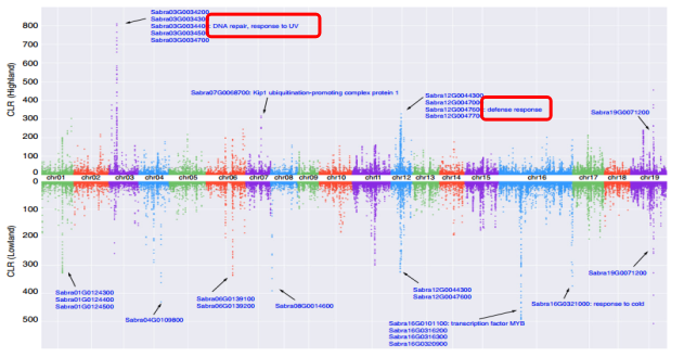 研究結(jié)果2:自然選擇在小墊柳高、低海拔群體中的作用區(qū)域和強度都具有顯著的差異,說明分布于橫斷山區(qū)海拔高差大、生境多樣而異質(zhì)的物種可能在自然選擇的作用下發(fā)生種下的種群分化(Sabra3G0034400DNA修復,Sabra12G0047600細菌防御應(yīng)答,Sabra16G0101100細胞對DNA損傷刺激的應(yīng)答和對寒冷的應(yīng)答)。