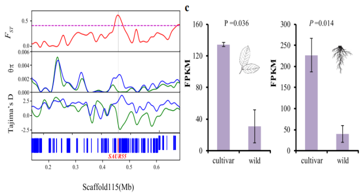 研究結(jié)果2:在開心果中,基因組上約有 9.2 Mb 的區(qū)域被鑒定為具有高水平的群體分化,包含665個基因,其中開心果株型可能與 SAUR55 基因的選擇相關(guān),同時該基因 表現(xiàn)出了顯著增加的表達水平;果實重量的變化發(fā)生在馴化與人工選擇期間(CYCD7-1基因)。