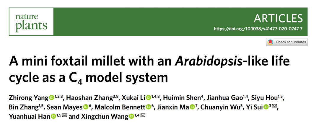 2020年8月31日,山西農業大學雜糧分子育種團隊與中國農業科學院作物科學研究所等單位合作研究論文“A mini-foxtail millet with an Arabidopsis-like life cycle as a C4 model system”在線發表于國際期刊Nature Plants(IF:13.256),報道了C4禾谷類研究的理想模式植物“小米”的研究成果。山西農業大學的楊致榮教授、中國農業科學院作物科學研究所的張皓珊博士和山西農業大學的李旭凱副教授為論文的共同第一作者;山西農業大學的王興春教授、韓淵懷教授和中國農業科學院作物科學研究所的隋毅副研究員為論文的共同通訊作者。美國普渡大學和英國諾丁漢大學等單位參與了部分研究。百邁客有幸參與了其中基因組、轉錄組及數據庫構建工作。目前,數據庫由百邁客負責維護和運行,暫時托管在公司服務器(http://foxtail-millet.biocloud.net/home)。