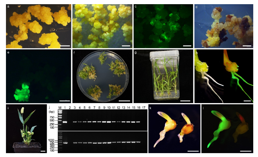 研究者對各種因素進行了測試,以開發出適合“小米”的農桿菌介導的轉化方案。并挑戰使用成熟種子作為愈傷組織誘導的起始材料,以避免在使用新鮮組織(如幼花序或未成熟胚)誘導愈傷組織時的昂貴需求。在改良的愈傷組織誘導培養基(CIM)上進行三輪繼代培養后,獲得了致密的胚性愈傷組織(圖8a)。通過使用綠色熒光蛋白(GFP)報告基因來監測農桿菌感染效率,如圖8b、c所示,以及篩選轉基因愈傷組織的有效性。“小米”的再生能力在CIM培養基上保持良好(圖8f)。表達GFP的轉基因植株在生根培養基上容易誘導生根,移栽到土壤后成活良好(圖8g-i)。