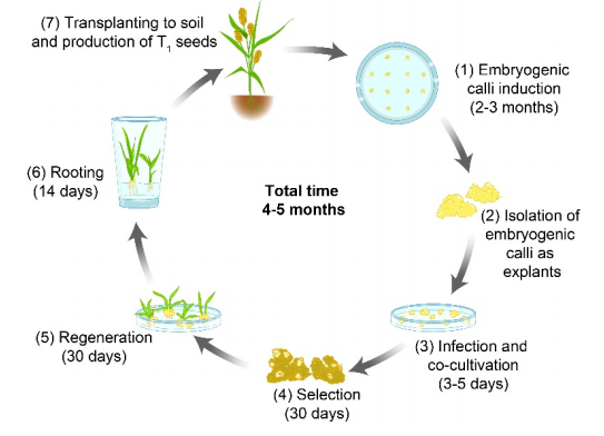 用HPT或NPTII標記的13個獨立轉基因系的基因組測序證實了轉基因插入“小米”基因組的正確性,并通過PCR進一步確定了3個檢測系的T-DNA插入位點。在盆栽中培育了代表8個轉基因事件的T1植株,觀察到與未轉化的“小米”植株沒有明顯的表型差異。因此,研究者建立了一個有效的方案,允許在2-3個月內(從農桿菌感染算起)或4-5個月內(從成熟種子開始愈傷組織算起),完成生產準備移植到土壤中的轉基因植物(圖9)。