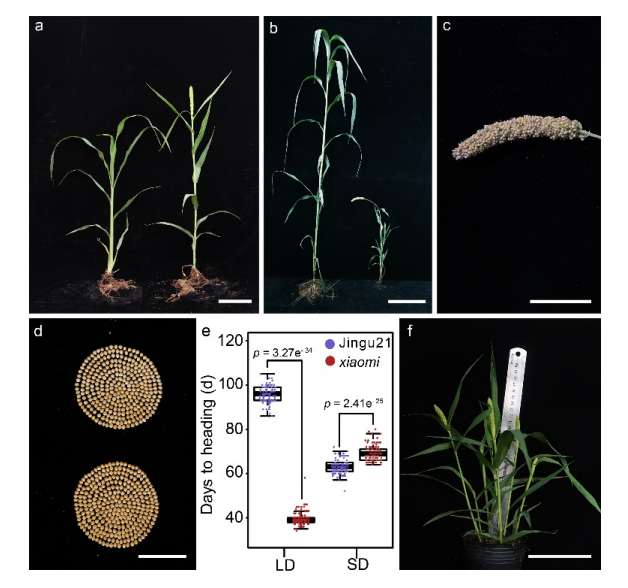 “小米”主要有以下特征:(1)表現出極早的開花表型:抽穗期39天(播種后天數,DAS)左右,約70天內完成了生命周期。而野生型(晉谷21,WT)的平均抽穗期約為82 天(DAS),成熟期為130 DAS(圖1b、c);(2)“小米”比野生型矮(圖1b),但結實率高12.83%,且種子大小沒有顯著差異(圖1d);(3)“小米”在短日(SD,10h光照/14h暗)條件下比長日(LD,16h光/8h暗)條件下的抽穗晚了約一個月,表明“小米”的早期抽穗依賴于LD條件(圖1e)。通過延長日長和優化其他條件,可以將“小米”的生命周期縮短到65天,株高約為29厘米(圖1f),每年可以在成長室里完成5到6代。(4)僅需較小的種植面積,類似于種植等量的擬南芥植株。