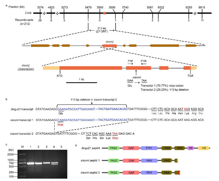 將“小米”基因組序列與經基因組重測序生成的晉谷21基因組序列進行比較,發現在定位區域只存在一個突變——“小米”基因Si9g09200的編碼區從“G”到“T”的突變,該基因編碼一種假定的PHYC蛋白(圖2a)。在所檢測的77個早期抽穗F2個體中,均為T/T純合突變體。相比之下,在256個晚抽穗個體中,92個是G/G WT純合子,另外164個是G/T雜合子,反映了基因型和表型之間的完美關聯。這種突變產生了一個終止密碼子,形成一個截短的蛋白質,占該基因約71%的轉錄本(轉錄本1)(圖2a-d)。這一突變還導致了113 bp的移碼缺失的剪接,形成了占該基因約29%轉錄本(轉錄本2)的截短蛋白(圖2a-d)。根據預測,被截斷的蛋白質缺少第二個PAS結構域的三分之二(肽1)或三分之一(肽2),以及整個HK和HD域(圖2d)。