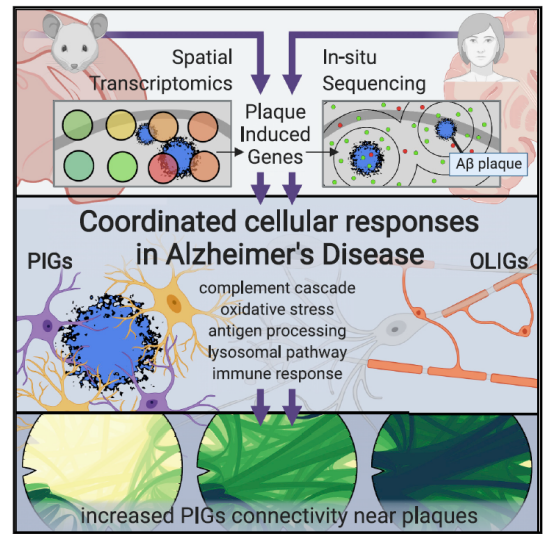簡述:本文結合空間轉錄組(ST)和原位測序(ISS)研究人鼠大腦,揭示了兩種由淀粉樣蛋白斑沉積誘導的的阿爾茲海默癥(AD)多細胞基因網絡—-斑塊誘導基因(PIG)網絡和少突膠質細胞基因(OLIG)響應。