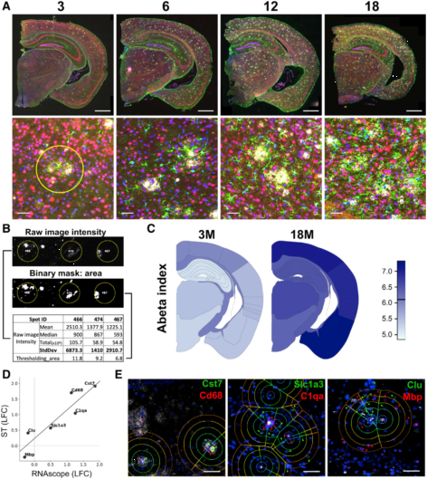 為了解基因表達的變化,作者進行了兩個差異表達分析。首先比較AppNL-G-F?和 C57BL/6(基因模型),其次是Aβ沉積對基因表達的影響(Aβ模型)。作者使用6個轉錄本進行經典的RNA原位雜交實驗來驗證Aβ模型(圖2D&E),根據模型,18月齡的AppNL-G-F,Cst7,Cd68,C1qa,Slc1a3,Clu和Mbp表達異常。在圖2D中可以看到,ST的數據和RNA原位雜交數據高度相關,這也證實了本方法的有效性。