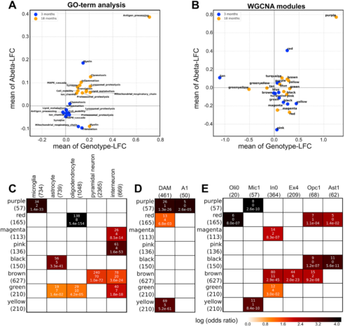 具有相似表達模式的基因很可能擁有相似的功能,因此可以通過加權基因共表達網絡分析(WGCNA)進行模塊聚類。作者研究了10327個轉錄譜中變化程度*大的50%的基因,識別出12個模塊,并使用GOrilla提取了可能的生物學功能、Aβ暴露的表達變化、3月齡和18月齡的基因型、細胞特征、受影響的腦區。