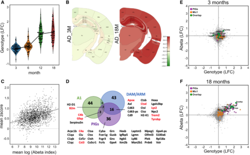 作者進一步研究了PIG模塊的細胞學特征,鑒定出其與激活的小膠質細胞(疾病相關DAM或者激活響應的ARM)和炎性星形膠質細胞(A1)有關聯(圖S3D)。重點突出了5個與A1標記重疊的PIGs和15個DAM/ARM 基因(圖3D)。另外36個PIGs以前并沒有被定義為疾病相關的神經膠質基因。激活的小膠質細胞和星形膠質細胞參與了前十的聯系*緊密的樞紐基因(圖3D,紅色)。作者評估這些PIGs是否可以在人數據庫中被鑒定出來。在41個細胞亞群中,與PIGs*相關的是AD相關的小神經膠質細胞(Mic1,圖S3E)。作者通過參與Aβ暴露和基因型的人Mic1??Marker基因的同源序列來放大基因表達變化(圖3E&F,橙&綠)。對小鼠的分析表明,人腦中的Mic1反應是對淀粉樣蛋白斑塊的大量的多細胞協調反應的一部分,而且這種反應會隨著時間的推移而演變。