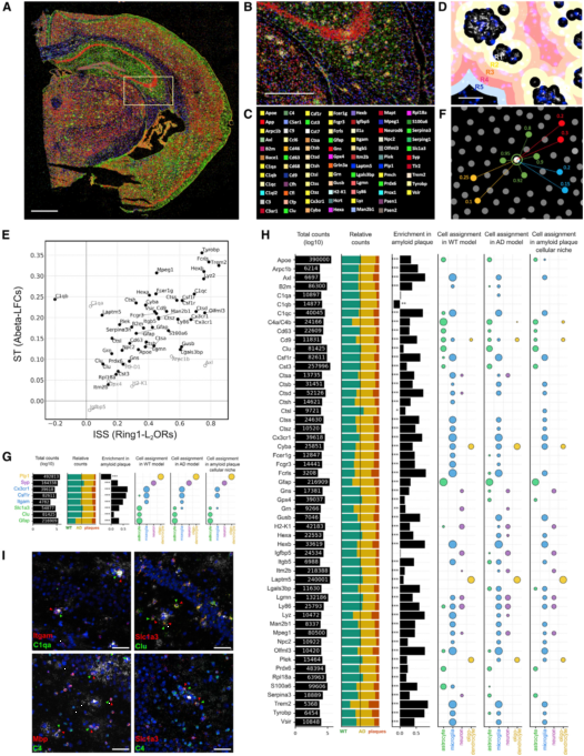 ST展示了淀粉樣蛋白斑周圍的多細胞反應,作者尋求一種正交獨立方法從單細胞分辨率下進行驗證。原位測序(ISS)可以在一個反應中使用許多靶向特異的原位標簽。作者使用了特制的探針來繪制PIGs表達以及細胞類型標簽(Itgam、 Cx3cr1、Csf1r對應小膠質細胞;Slc1a3、Gfap 、Clu對應星形膠質細胞; Syp對應神經元; Plp1對應少突膠質細胞;圖4A-C)。ISS實驗中,對AppNL-G-F和兩只18月齡WT小鼠各構建兩個文庫。用每個基因的熒光點數目來量化基因表達,并將熒光點聚類到淀粉樣蛋白斑周位的5個同心圓上(圖4D)。51/54個PIGs在圈1上明顯富集,而C1qb在圈1上明顯減少(圖4E)。ISS的結果與ST的結果線相關性非常好(圖4E)。