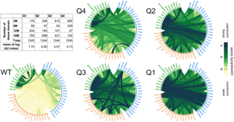 在WT中,所有PIGs的關聯相對較低,PIG被分為三個簇(圖5,綠、藍、橙)。ISS實驗(圖4H)證明了在綠色簇中,星形膠質細胞基因(7/12)富集,而藍色(14/23)和橙色(14/28)簇聚集了小膠質基因中表達的PIGs。在WT中,橙色的PIGs幾乎不關聯,而AppNL-G-F小鼠中,在接觸增長的Aβ后,這些PIGs的基因被招募。隨著Aβ指標增長,PIGs內部和相互之間的關聯增強。在Q4-Q1中,隨蛋白斑積累程度增加,互作關系明顯增加。