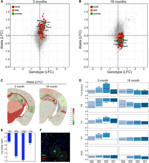作者進而更詳細地從Aβ指標和OLIG表達的關系方面分析這些區域的不同。在圖2中,Aβ沉積隨疾病的進展而不同。甚至在3個月時,有些TDs暴露于Aβ(圖5,Q1中179個TDs)。隨著Q4-Q2中TDs的Aβ緩慢增長,OLIG表達增加(圖6D)。但是,三月齡有著*高Aβ暴露(Q1,比Q4中Aβ高21倍)的TDs中OLIG的表達存在一種降低的趨勢。另外,低Aβ暴露的TDs中OLIG模塊的基因對的連接強度之和*強。為了進一步證明發現,作者對三月齡AppNL-G-F小鼠的整個冠狀切片,設計四個OLIGs(Plp1、Mbp、Olig2Cnp)探針做RNA原位雜交(圖6E&F)。結果顯示,在三月齡小鼠稠密的淀粉樣蛋白斑周圍,這4個OLIGs明顯減少。可以推測,在輕度Aβ暴露下,OLIG模塊高表達和相互連接,但在高密度Aβ積累的微環境中表達減少。因此,部分OLIG模塊的區域差異與不同的Aβ暴露有關。