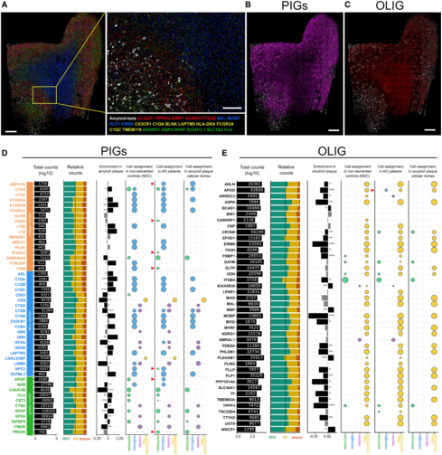作者使用3名AD患者和3名正常對照組死后的人腦樣本進行實驗。AD大腦處于淀粉蛋白斑C階段和神經元糾纏V-VI階段的疾病進展期。研究描繪了與AD相關的額上回組織譜,總共報告了222個基因表達譜,包括45個人PIGs同源序列,OLIG模塊中42個斑塊反應基因的同源序列,以及一系列細胞類型Marker。這些細胞Marker很好地在細胞分辨率下描繪了大腦區域(圖7A)。PIG模塊(圖7B,紫色)和OLIG模塊(圖7C,紅色)基因如預期的在大腦灰質和白質中富集。