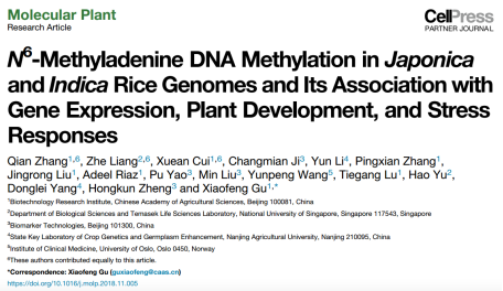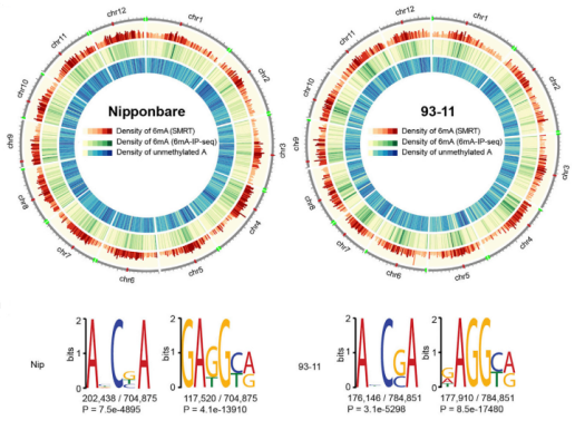 PacBio對粳稻Nip與秈稻93-11基因組更新:利用PacBio對Nip和93-11進行測序及Illumina平臺進行gap填充和誤差校正后,Nip基因組大小為380.7 Mb(contig N50=16.97 Mb),93-11基因組大小為396 Mb(contig N50=9.64 Mb);進一步通過SMRT(單分子實時測序系統Single MoleculeReal Time)測序數據,在Nip和93-11中分別檢測出704875個和784912個6mA位點。