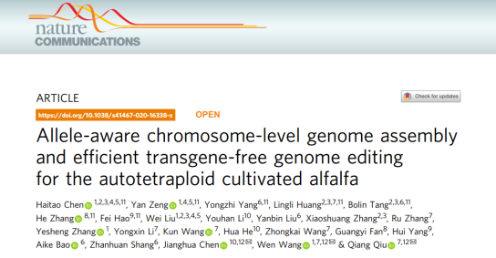 文章中利用了基因組三代測序技術,獲得染色體級別的紫花苜?;蚪M的同時,攻克了同源多倍體物種基因組組裝難題,組裝獲得了4個單倍型紫花苜?;蚪M,為后續基因編輯研究做了重要的鋪墊,進而通過新技術CRISPR/Cas9基因編輯對控制相應表型性狀基因進行改造,對于紫花苜蓿后續分子生物學研究具有重要而深遠的意義。