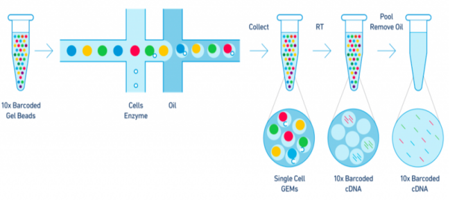 單細胞測序,簡而言之,就是獲取單個細胞遺傳信息的測序技術,其中10 X Genomics單細胞轉錄組測序平臺具有廣泛的應用。該技術利用微流控、油滴包裹和barcode標記等技術來實現高通量的細胞捕獲技術,能夠一次性分離、并標記500–10000個單細胞,從而獲得每個細胞的3’端的轉錄組信息。主要用于細胞分型和標記因子的鑒定,從而實現對細胞群體的劃分與細胞群體間基因表達差異的檢測,此外該技術還可以預測細胞分化與研究發育軌跡,在當下疾病、免疫、腫瘤領域以及組織、器官、動植物發育研究中發揮越來越重要的作用。