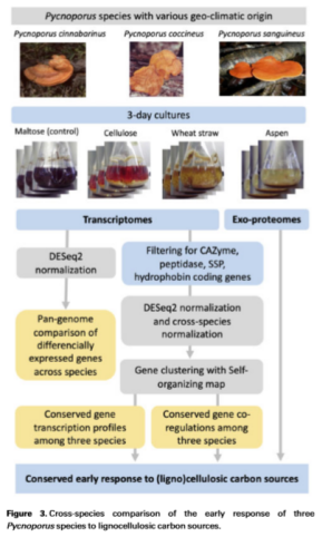 選取四種不同地理分布的擔子菌門/密孔菌屬真菌(P.coccineus、P.sanguineusand、P. puniceus、P.cinnabarinus)研究其在不同類型的纖維素基質下相關酶的代謝情況。通過設置不同碳素培養基:麥芽糖(對照)、秸稈、松木、楊木,模擬對自然界中不同材質的木材的分解能力。探究Pycnoporus屬在基因組、轉錄組、分泌蛋白組層面的共性和差異性,以期找出它們在木質纖維素降解上存在的共性機制。