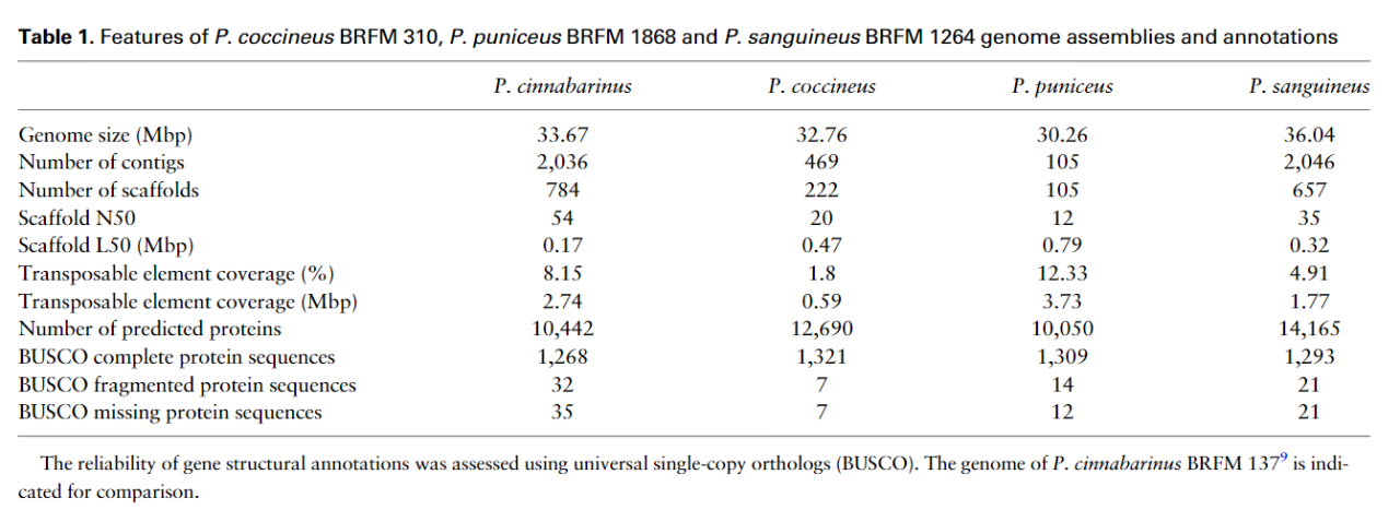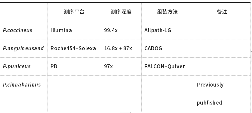 分別對P.coccineus、P.sanguineusand、P. puniceus、P.cinnabarinus的基因組進行測序和組裝,四種真菌基因組大小差異不大,編碼基因組的數量上也比較接近。