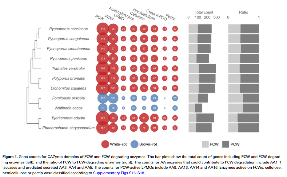 與褐腐菌相比,白腐菌含有更高比例的PCW(植物細胞壁)降解活性相關的CAZymes和FCW(真菌細胞壁)降解活性相關的CAZymes,這也是白腐菌與褐腐菌降解木質纖維素的能力不同的重要原因。