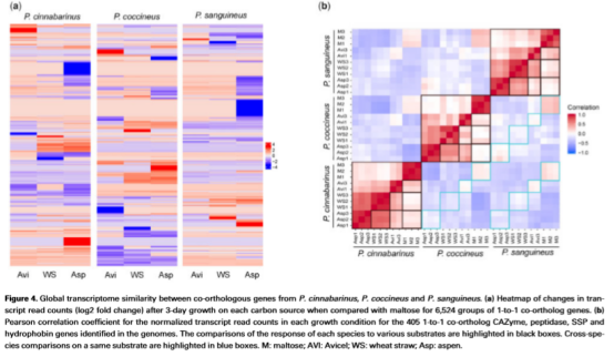 對Pycnoporus真菌和其他木材降解真菌中的CAZyme基因含量的進行比較分析。4種Pycnoporus菌中CAZyme基因數量非常相似(平均436個CAZymes,分成108家族),并且和細胞壁降解相關的酶與其他真菌相似。說明在白腐菌中碳水化合物活性酶參與的作用模式比較接近。