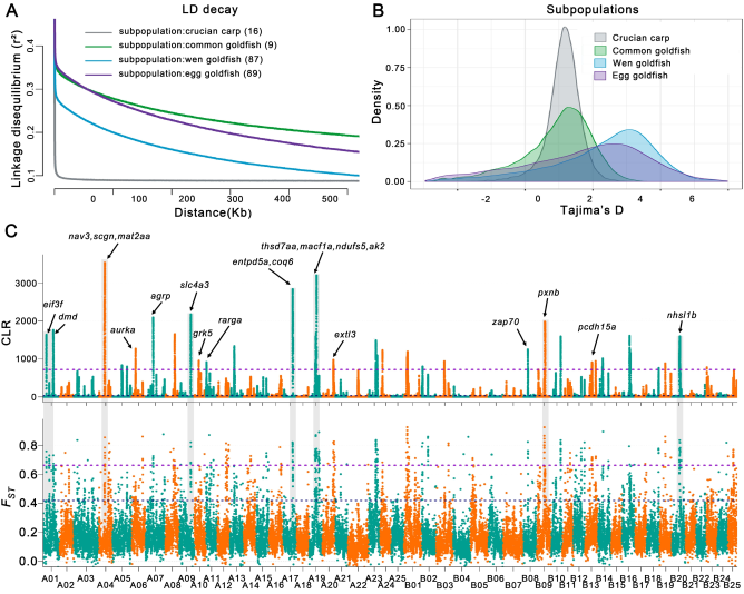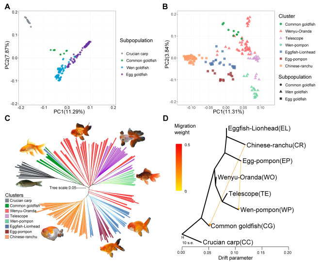 通過201個個體(16只野生鯽魚和185只代表性金魚變種,平均測序深度12.5 x)的系統發育樹構建發現普通金魚與鯽魚親緣關系最近(圖4 A-C),進一步結合系統發育樹和PCA分析確定各金魚變種的系統分化關系,區分普通金魚和卵金魚(無背鰭)和溫金魚(有背鰭),無背鰭金魚和有背鰭金魚進一步分為不同的亞群。