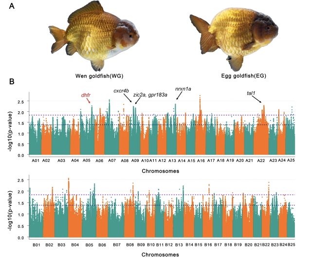 背鰭作為金魚一重要的表型特征,在不同變種中形態不一,背鰭是區分Wen金魚和Egg金魚的顯著特征,背鰭的縮小是Egg金魚進化的關鍵特征。通過Wen金魚和Egg金魚雜交后代F1背鰭性狀分離比,暗示了了背鰭特征受多個基因位點控制,可能具有母體遺傳效應。對96只有背鰭和87只無背鰭金魚的全基因組關聯分析GWAS研究分析發現跨越13條染色體上的8.96 Mb區域上的378個基因與背鰭性狀相關(圖6),85.2% (322)個基因位于A亞基因組,大部分位于五條染色體上,包括ChrA09,ChrA07,ChrA22,ChrA16和ChrA05,比位于B亞基因組上的背鰭相關基因的數量高得多,這表明背鰭相關基因不對稱的亞基因組分布,GO和KEGG分析表明,該性狀的候選基因可能參與了“細胞表面受體信號傳導”途徑,“信號轉導”,“跨膜轉運”,“骨骼系統發育”和“初級代謝過程和器官氮化合物代謝過程”。進一步通過與斑馬魚直系同源基因基因敲除品系表現出的突變表型分析發現,二氫葉酸還原酶(dhfr)可能在某種程度上與魚鰭是否存在相關,該基因可能在金魚人工選擇過程中,在有無背鰭這一表型中發揮重要作用。