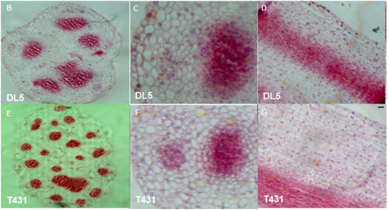 本研究利用石蠟切片法對其結構變化及不育原因進行觀察,觀察不育材料T431(圖1E)與對照材料(圖1B)成熟花柱的橫切,可以看出不育材料T431花柱中的維管束數目多于對照材料。同時形態觀察時發現不育材料花柱直徑顯著大于對照材料,維管束數目的增多可能直接導致了不育材料花柱直徑變大(圖1C, D, F, G)。觀察成熟花柱的細胞發現不育材料與對照材料花柱細胞大小沒有顯著差別。因此說明不育材料花柱伸長是由花柱細胞數目增多導致而非細胞體積變大導致。