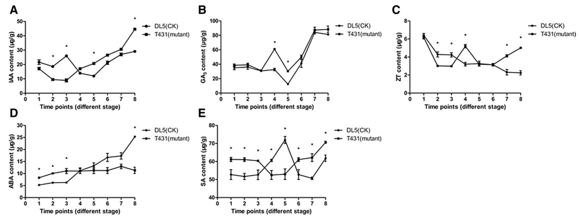 圖2 T431(不育材料)和DL5(對照材料)中不同激素在不同時期的變化趨勢