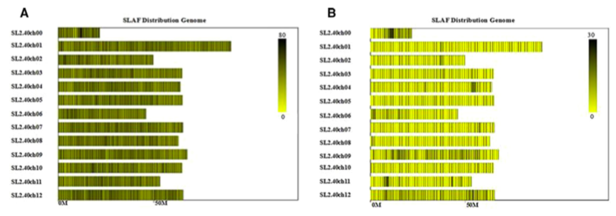 圖3 SLAF標簽分布圖(A)和多態性SLAF標簽分布圖(B)