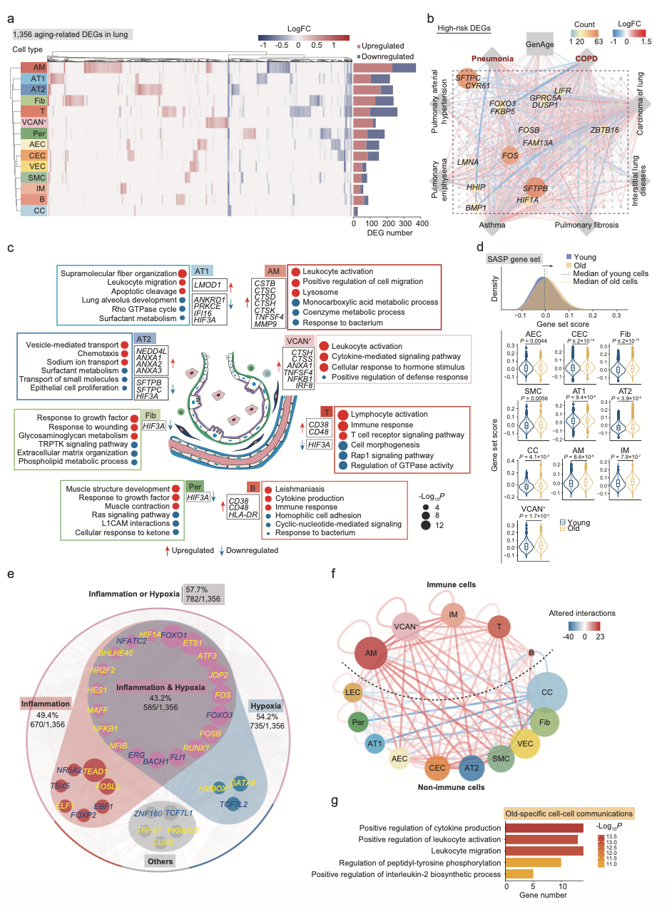 為了闡明細胞水平上與衰老相關的分子機制,作者在個性肺細胞中識別和衰老相關的轉錄組變化。通過差異分析(| logFoldChange(logFC)| 0.25,調整后的P值<0.05)顯示,共獲得1356個差異基因(圖2a)。衰老過程中受影響最大的細胞包括AMs、T細胞、成纖維細胞、AT1和AT2,在老年和青年肺亞型中分別有372、262、239、235和217個差異基因。通過數據庫注釋,這些基因包含了肺部疾病(COPD、肺炎、肺纖維化、哮喘等)的熱點基因。下調的DEGs參與上皮細胞增值、止血和表面活性物質代謝(圖2c),提示衰老過程中肺功能受損。此外,SASP相關基因在10中類型細胞中過表達(圖2d),表明老年肺以細胞應激和慢性炎癥為特征。具體來說,上調的DEGs與囊泡介導的轉運有關(圖2c),這可能構成病毒內化的一個貢獻者。在蛋白水平上,通過免疫熒光分析證實了缺氧誘導的轉錄因子HIF1在老年肺中表達上調,提示老年肺可能發生明顯的缺氧應激反應,這可能是導致深度衰老的原因之一。通過上皮細胞和免疫細胞的轉錄特征分析,觀察到21個囊泡介導的轉運相關基因在AT2細胞中,這可能與病毒的進入、組裝等相關。因此,這些結果揭示了衰老可能導致肺泡上皮屏障功能衰退以及病毒防御能力受損。