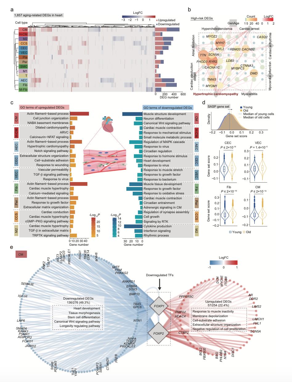 總的來說,老年肺組織中許多免疫細胞類型的比例增加,包括肥大性細胞和漿細胞,他們分泌細胞因子和抗體導致年齡相關性炎癥、慢阻肺病和肺纖維化的比例增加。 為了探索衰老心臟中細胞特異性的分子機制,作者篩選出了1857個差異基因(|logFC| > 0.25, P value < 0.05)(圖3a),其中數十個基因是肥厚型心肌病的熱點基因(圖3b)。反映了心臟中與年齡相關的基因表達變化與老年人心臟病高發之間的緊密聯系。