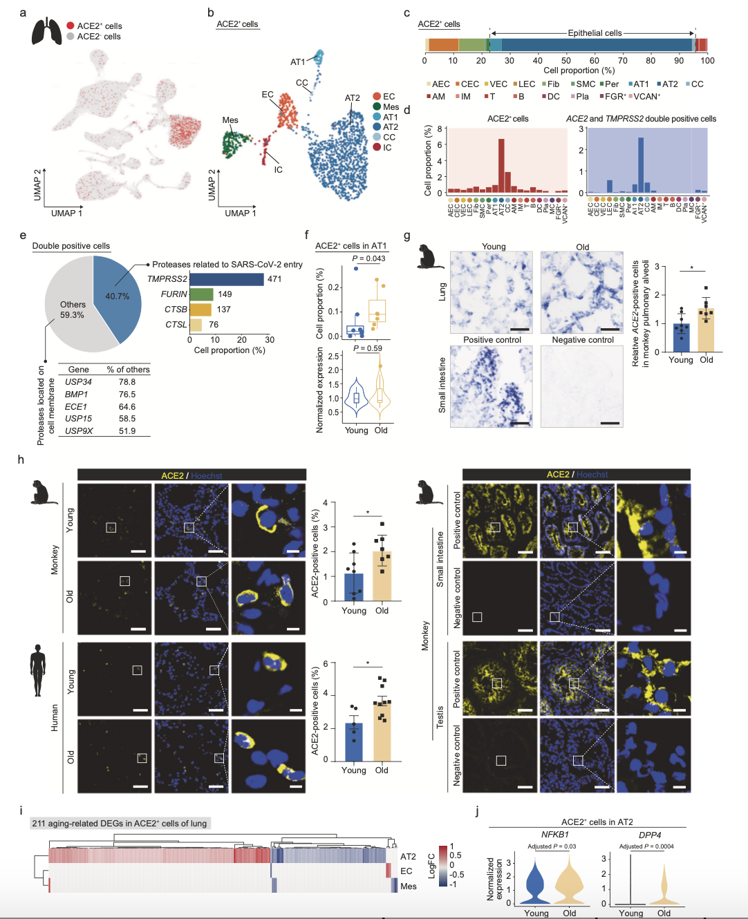 為了識別可能被SARS-CoV-2靶向的細胞類型,作者分析了ACE2、TMPRSS2、FURIN和其他可能的輔助蛋白的細胞特異性的表達模式。在肺中,ACE2在AT2(7%)、AT1(1%)、纖毛細胞(3%)等類型中表達(圖4b-d),另外還發現,一小部分內皮細胞表達ACE2、AECs、CECs均表達為0.2%,AT2和AT1中檢測到大多數ACE2和TMPRSS2雙陽性細胞。組織蛋白酶家族成員的FURIN、CTSB、CTSL等膜錨定蛋白酶與ACE2共表達。這些數據確認AT2和AT1是肺中COVID-19的易感細胞類型。有趣的是,衰老細胞中ACE2陽性的AT1細胞比例增加了約2倍。更重要的是,衰老過程中,NHP和人肺部的免疫染色均證實了肺泡周圍ACE2陽性細胞的增加,提示隨著年齡的增長,肺泡表面更容易感染SARS-CoV-2的細胞比例增加。