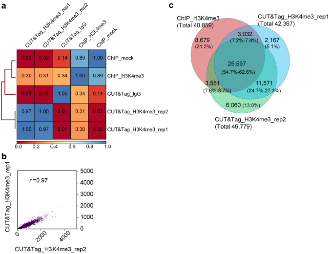 對CUT&Tag和ChIP數據進行相關性分析,發現CUT&Tag的兩個生物學重復(CUT&Tag_H3K4me3_rep1和CUT&Tag_H3K4me3_rep2)與對照CUT&Tag_IgG相關性非常低(r=0.01,Pearson’s correlation),表明CUT&Tag實驗組和對照組(背景噪音)存在顯著性差異(圖3,a),然而,ChIP_H3K4me3實驗組與ChIP_mock具有很高的相關性(r=0.89,Pearson’s correlation),這表明,ChIP分析中信號-噪音比例很高(圖3,a),而CUT&Tag實驗組的兩個生物學重復相關性近乎完美(r=0.97,Pearson’s correlation),說明不同的生物學重復之間重復性非常好(圖3,b)。