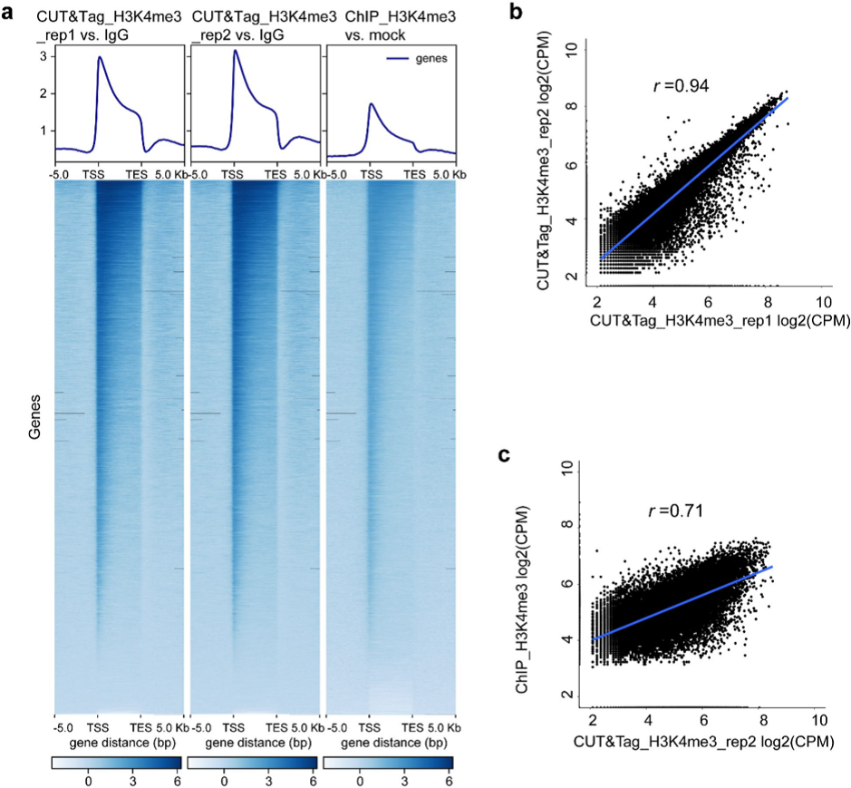 FRiP(fraction of reads in peaks)values calculated the ratio of mapped reads that fall into peaks among all mapped reads. FRiP值越高,信噪比越高,結果也越可靠。結果表明CUT&Tag產生的信噪比較高(FRiP=0.7;表1)。然而,從H3K4me3信號熱圖上可以看出,在整個gene body區域CUT&Tag的信號比ChIP-Seq更強(圖4,a)。從相關性分析的結果可以看出,基因附近的peaks在CUT&Tag兩個生物學重復之間相關性很高(r=0.94,pearson’s correlation;圖4,b),CUT&Tag和ChIP之間的相關性也較高(r=0.71,pearson’s correlation;圖4,c)。