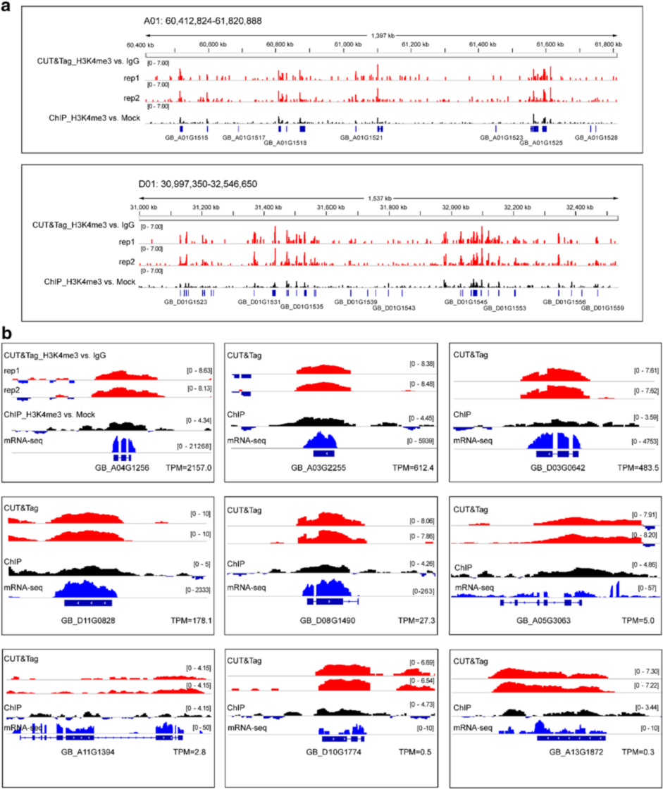 與熱圖顯示的強度一致,IGV截圖表明CUT&Tag信號在分辨率和靈敏度上的表現優于ChIP(圖5,a),尤其在表達量相對低的基因中表現尤為明顯(如GB_A11G1394, GB_D10G1774, 和 GB_A13G1872;圖5,b)