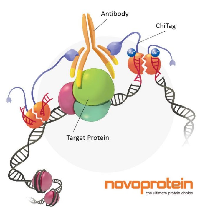 CUT&Tag使用Protein A與Tn5轉座酶的融合蛋白(ChiTag),在抗體的引導下,Protein A與染色質上的目的組蛋白修飾標記、轉錄因子或染色質調控蛋白結合,連帶的Tn5轉座酶對目的蛋白附近的DNA序列進行切割,并將測序接頭連接到切割片段的兩端(圖1),并釋放到細胞外,PCR擴增后直接用于高通量測序。