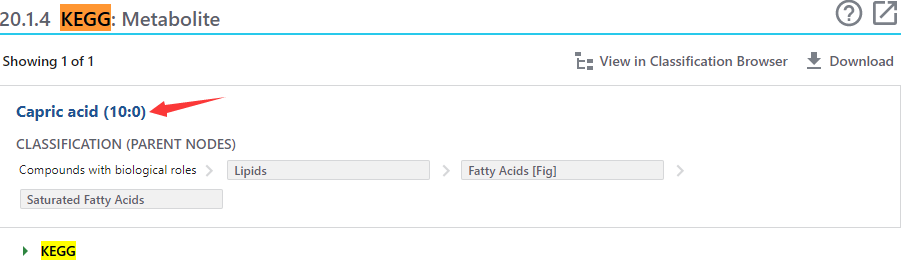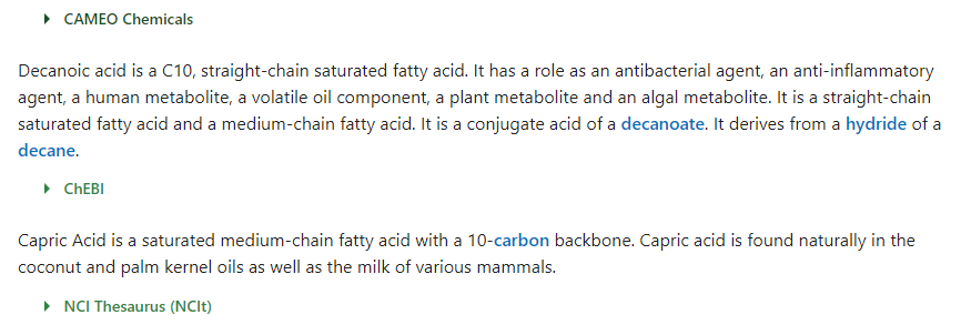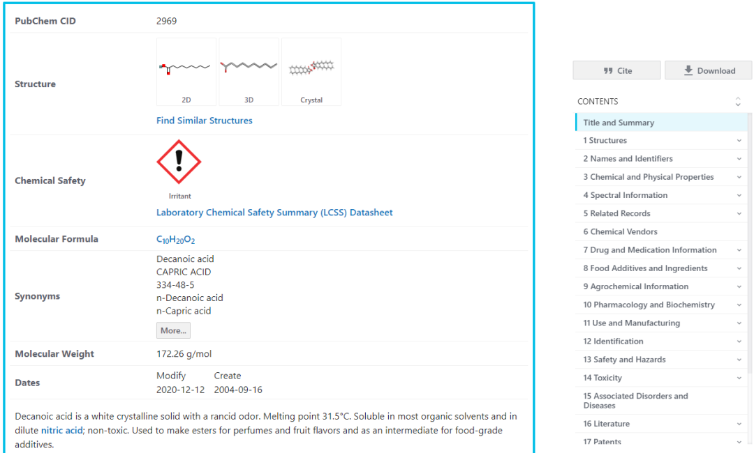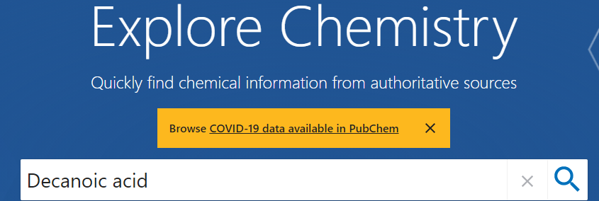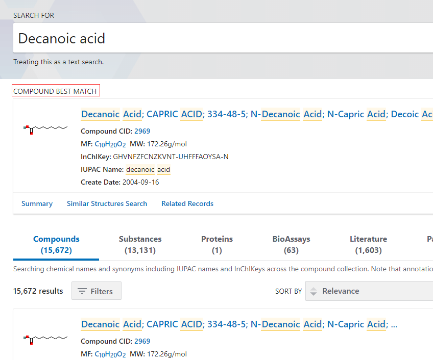 Pubchem(https://pubchem.ncbi.nlm.nih.gov/),它是NCBI下的一個大型的、綜合性的化合物數(shù)據(jù)庫,目前收錄了1億多種化合物信息,支持名稱、縮寫、化學(xué)式、系統(tǒng)命名等多種方式檢索,其結(jié)果包含了化合物的各種命名、相關(guān)聯(lián)的數(shù)據(jù)庫信息、結(jié)構(gòu)、分類、理化性質(zhì)、文獻、質(zhì)譜圖等多種信息。其中頁面開頭的摘要部分可快速了解到該物質(zhì)的特性、生物功能等信息,根據(jù)提供的文獻信息可幫助我們了解目前的研究情況。今天小編以“癸酸”為例教大家如何快速了解一個陌生的代謝組化合物。首先我們在主頁搜索欄中輸入癸酸英文名Decanoic acid,點擊搜索后會得到多個結(jié)果,置頂?shù)囊话銥樽罴哑ヅ洌@里是完全一致的,可以確認(rèn)就是這個結(jié)果。