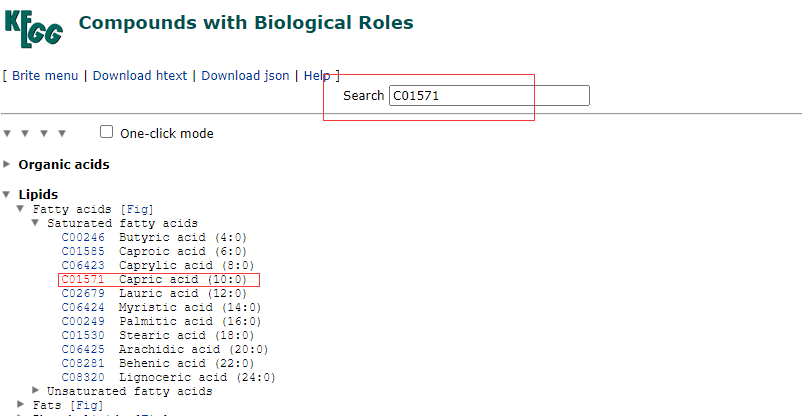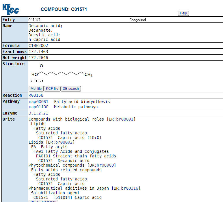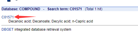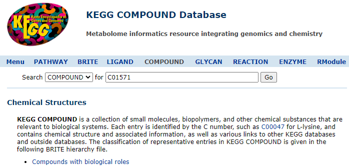 前文提到的KEGG(https://www.genome.jp/kegg/compound/)數(shù)據(jù)庫相信大家都不陌生,它是日本京都大學(xué)和東京大學(xué)聯(lián)合開發(fā)的數(shù)據(jù)庫。它有一個化合物庫,記錄了與通路相關(guān)的化合物,其化合物ID以C開頭,百邁客的分析結(jié)果提供了這個信息。這里我們將上述得到的C01571進行檢索: