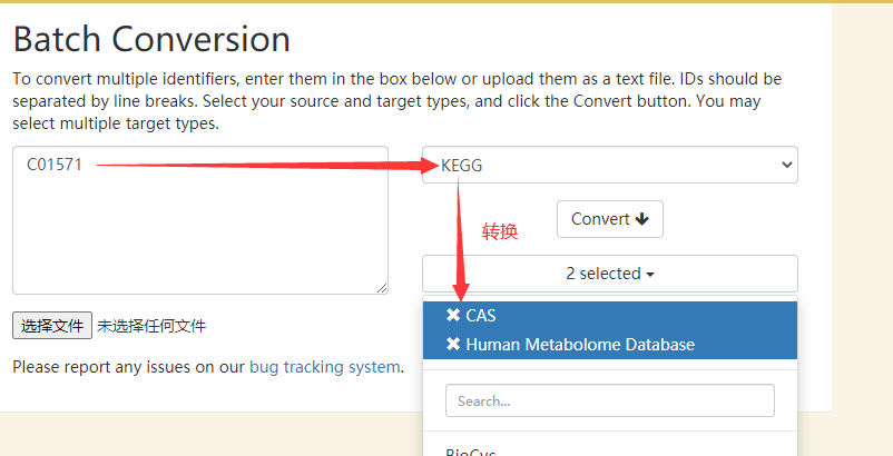 通過前面的檢索頁面我們會發(fā)現(xiàn)相同的代謝物在不同數(shù)據(jù)庫的ID不一樣,不要慌,小編給大家推薦一個好用的ID轉(zhuǎn)換網(wǎng)站:http://cts.fiehnlab.ucdavis.edu/batch。這個網(wǎng)站支持多種數(shù)據(jù)庫,而且可以批量哦!。以C01571(類型為KEGG)為例,查詢其CAS和HMDB信息,見下圖: