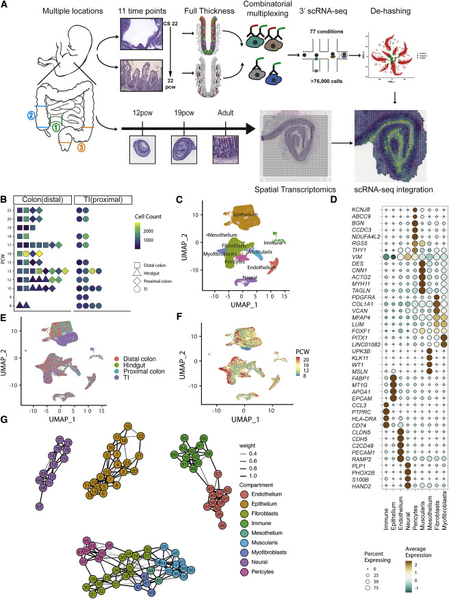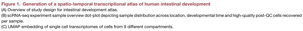 研究人員從代表了不同的發(fā)育時間和組織位置的17個單獨的胚胎中收集了77個腸道樣本繪制成單細(xì)胞圖譜 (Figures 1?A和1B),數(shù)據(jù)集范圍從8到22 PCW,跨越隱窩形成之前的時間點,直至成人狀絨毛/隱窩形態(tài)的發(fā)展(FiguresS1A)。使用寡核苷酸標(biāo)記抗體,產(chǎn)生了76,592個細(xì)胞 (Figures 1A 和 S1B–S1I; STAR methods)。