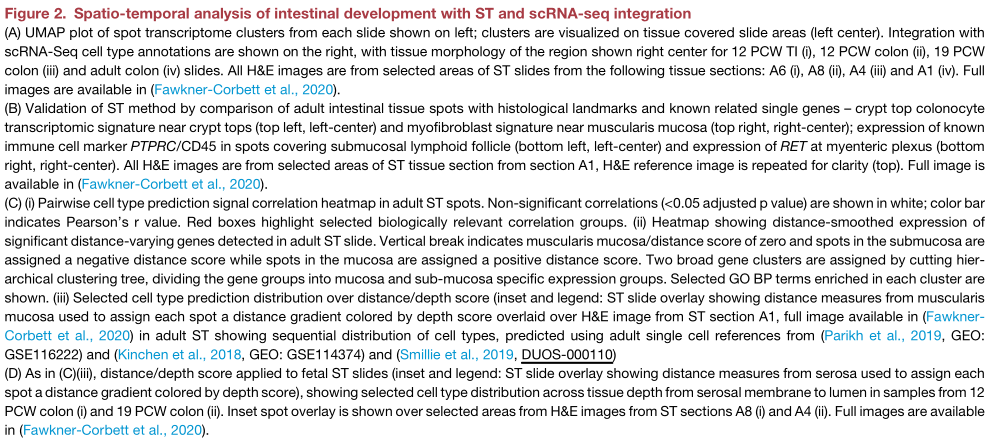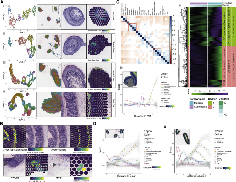 研究人員鑒定了2,893個與深度相關(guān)的基因(<5%FDR),反映了不同層次的活躍途徑(Figure Cii) -肌肉/神經(jīng)過程(收縮/軸突形成)向吸收管腔功能(微絨毛組織和消化系統(tǒng)過程)發(fā)展的深度富集點,與細(xì)胞類型特征的順序富集相符(Figure?2Ciii)。在胎兒ST顯著的差異包括外肌層和內(nèi)肌層在19個PCW時占據(jù)離散的空間層,而不是12個PCW時(Figure 2D)。
