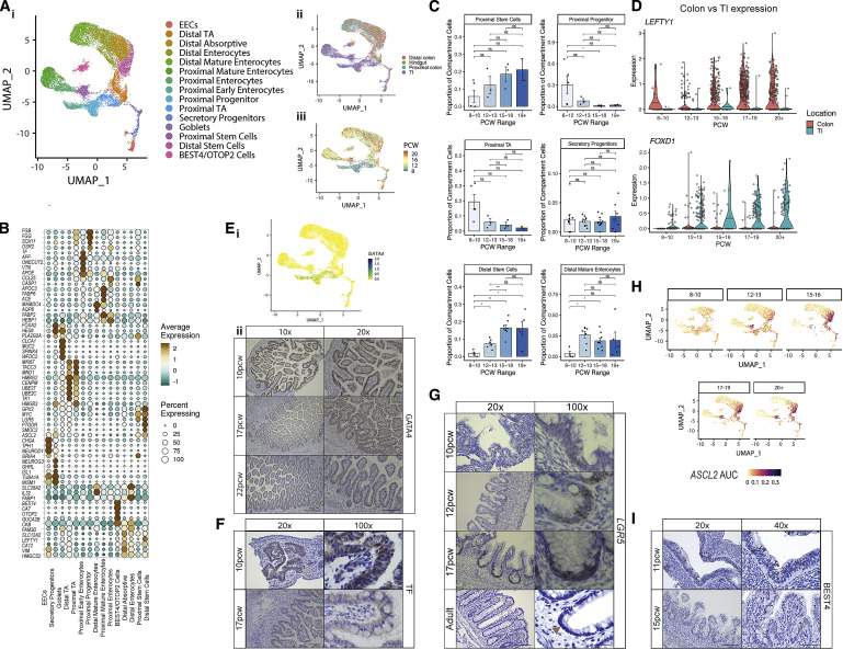 研究人員觀察到近端和遠(yuǎn)端ISCs隨著時間的推移逐漸增加。這與ISC轉(zhuǎn)錄程序的早期位置差異形成對比,例如遠(yuǎn)端LEFTY1和近端FOXD1及其下游調(diào)控網(wǎng)絡(luò)基因(Figure3C,3D和S3B)。這些差異由關(guān)鍵的位置信號轉(zhuǎn)通路支撐,例如,結(jié)腸LEFTY1通過激活素A受體(ACVR2B)參與了假定的神經(jīng)相互作FigureS3?C1)。在早期發(fā)育中(<12 PCW),研究人員發(fā)現(xiàn)了近端上皮干樣祖細(xì)胞群,該細(xì)胞群發(fā)展為早期腸上皮細(xì)胞。這些細(xì)胞表現(xiàn)出許多原始功能,包括在中胚層分化重要的VTN基因高表達(dá),與ISCs相比,LGR5表達(dá)較少,和ONECUT2表達(dá)參與上皮發(fā)育(Figure 3B和FigureS3?D)。這些細(xì)胞在SI中特異表達(dá)TF GATA4(Figure3Ei), SI是一種小鼠早期內(nèi)胚層調(diào)節(jié)因子,在12 PCW后,其表達(dá)大部分丟失這些細(xì)胞高表達(dá)轉(zhuǎn)鐵蛋白(TF)( Figure3B和3F),證實了鐵代謝在絨毛形成中的重要性。LGR5是一種典型的ISC基因,在妊娠早期(<12 PCW)的近端/遠(yuǎn)端廣泛檢測到低水平ISCs和干樣祖細(xì)胞(Figure3B和FigureS3D)。原位雜交(ISH)證實了在10PCW處彌漫的LGR5表達(dá),后來定位于隱窩堿基(Figure3G),類似于在雞和小鼠發(fā)育中報道的Lgr5的行為。即使在隱窩形態(tài)建立之后(如19 PCW之后),ISC仍分別構(gòu)成遠(yuǎn)端/近端樣本中捕獲的上皮細(xì)胞的18%–22%(Figure3C),高于成人結(jié)腸的scRNA-seq研究捕獲的3%-4%。與此相符,研究人員發(fā)現(xiàn)ASCL2?TF模塊(包括下游目標(biāo)LGR5)隨著發(fā)育時間的增加而顯著增加(Figure3H)。