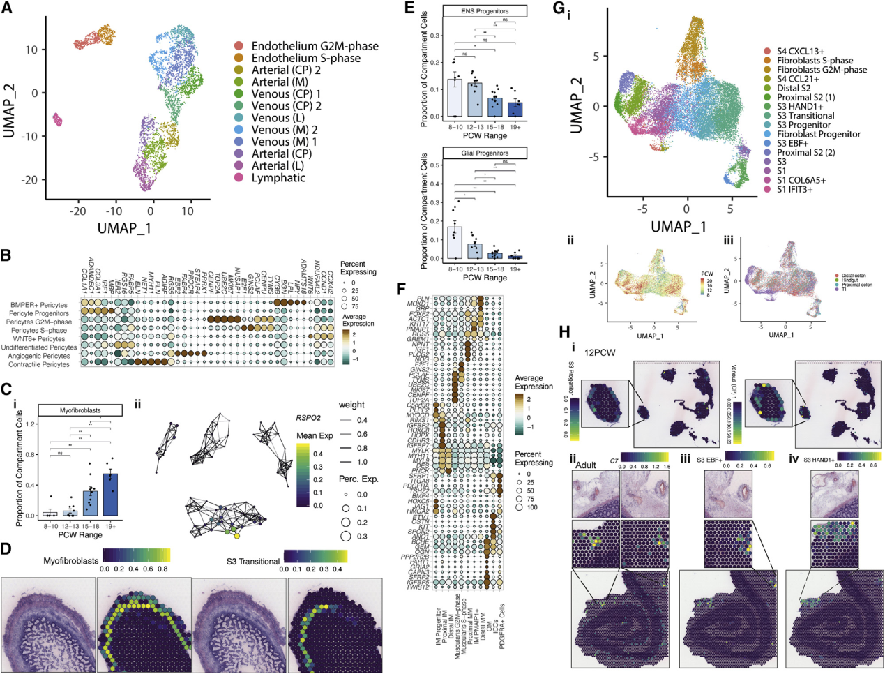 轉(zhuǎn)錄標(biāo)簽通常對應(yīng)于結(jié)構(gòu)特征。在EC中可以清楚地看到這一點,將EC分為靜脈,動脈和淋巴管類型,并通過血管大小進(jìn)一步區(qū)分(Figure4?A;TableS1)。在發(fā)育過程中,觀察到了從小血管到大血管的過渡,反映了腸道血管生成(Figure S4?A)。確定了驅(qū)動這種變化的TF網(wǎng)絡(luò),例如動靜脈分化器HEY1和SOX13。成年ST的脈管系統(tǒng)很容易識別成年EC和胎兒EC信號(Figure S4?B)。與EC相對的,周細(xì)胞亞型由血管生成驅(qū)動因子(PRRX1,THBS4和ANGPT2)定義(Figure 4?B;table S1)。ANGPT2是EC-周細(xì)胞RL相互作用的關(guān)鍵調(diào)節(jié)因子,已證實其位于胎兒脈管系統(tǒng)中(Figure S4C)。盡管EC隔室與8 PCW處存在的大血管細(xì)胞截然不同,但周細(xì)胞種群顯示出發(fā)育滯后。為了了解這些分化動力學(xué),研究人員將G2M和S期周細(xì)胞與G1期細(xì)胞進(jìn)行了比較,發(fā)現(xiàn)在較早時間點的大多數(shù)細(xì)胞是高度循環(huán)的祖細(xì)胞(Figure S4?D)。這些種群與成纖維細(xì)胞和原始的ACTA2?+細(xì)胞共享轉(zhuǎn)錄特征,這一結(jié)果受到軌跡分析的支持(Figure S4?E)。綜上所述,提出了早期成纖維細(xì)胞向周細(xì)胞的轉(zhuǎn)變,然后是來自未成熟WNT6表達(dá)細(xì)胞的第二波周細(xì)胞增殖-分化。16 PCW時,成熟的成肌纖維細(xì)胞表現(xiàn)出相似的發(fā)育滯后(Figure 4?Ci;table S1)。文獻(xiàn)表明腸道成肌纖維細(xì)胞可能來自多種來源,并且圖形抽象顯示成熟的成肌纖維細(xì)胞類似于肌肉細(xì)胞,在特定基因(例如RSPO2,F(xiàn)igure 4?Cii)中存在明顯差異。然而,肌成纖維細(xì)胞祖細(xì)胞卻表現(xiàn)出來自成纖維細(xì)胞和周細(xì)胞的梯度譜;在19 PCW的ST中,它們占據(jù)了與過渡間質(zhì)細(xì)胞相鄰和重疊的層。(Figure 4?D和S4?E)。