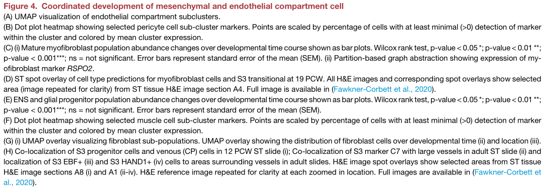 為了更好地理解S3亞型功能,研究人員研究了RL互作,注意到與EC的大量串?dāng)_預(yù)測(FigureS6D)。其中許多是通過調(diào)節(jié)結(jié)腸成纖維細(xì)胞中組織纖溶酶原激活受體LRP1介導(dǎo)的。為了在ST數(shù)據(jù)中證實這一點,研究人員進(jìn)行了RL空間共表達(dá)分析,該分析確定了在空間上對隱窩頂部進(jìn)行強(qiáng)空間共定位的RL對,例如CEACAM1和CEACAM5(FigureS6Ei)。在成人和胎兒組織中觀察到LRP1與血管外基質(zhì)的關(guān)鍵成分HSPG2配體的顯著共定位(p = 2.17×10-112和p = 2.37×10-29(成人);p = 2.9×10-19和 p = 0.005(12 PCW) (Figure S6Eii和S6Eiii)。在胎兒ST中,研究人員將S3簇定位于與EC相關(guān)的深度和區(qū)域(Figure4Hi),將幾種S3特異性基因(如FigureC7)的表達(dá)定位于成年組織中與脈管結(jié)構(gòu)相鄰的斑點,因為這些結(jié)構(gòu)比胎兒切片更清晰可見(Figure4Hii)。將胎兒細(xì)胞類型標(biāo)簽轉(zhuǎn)移到成人ST上,發(fā)現(xiàn)S3 HAND1 +和S3 EBF +細(xì)胞的成年配對體聚集在大血管周圍(Figure4Hiii–4Hiv),突顯了這些細(xì)胞在形成腸血管支持位支持生態(tài)位中發(fā)揮的作用,已通過成對細(xì)胞類型信號相關(guān)性分析證實,其中EC,周細(xì)胞和“S3”型成纖維細(xì)胞信號在同一ST點內(nèi)相關(guān)(Figure 2Ci)。