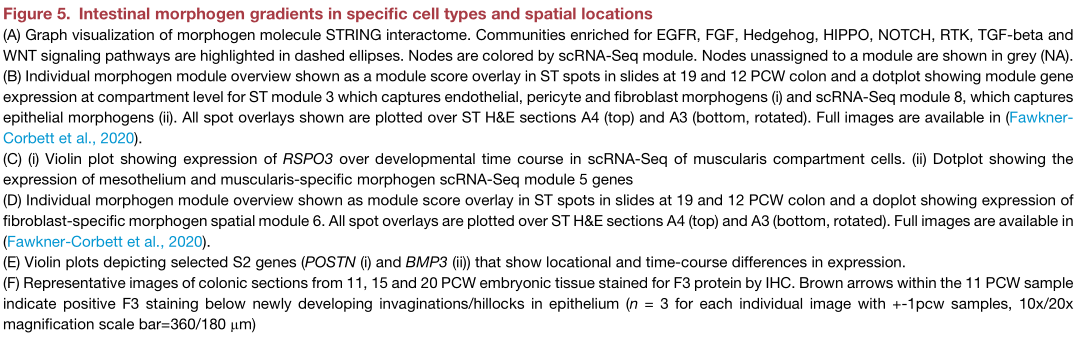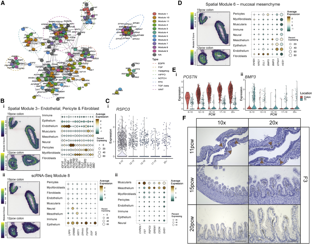 理解腸道發(fā)育的基本問題是局部形態(tài)發(fā)生梯度及其拮抗劑是如何塑造腸絨毛形態(tài)發(fā)生的。研究人員創(chuàng)建了一個涉及8條途徑的基因形態(tài)發(fā)生圖,用以闡明這些分子在空間和時間上的作用。利用共表達(dá)分析確定了11種細(xì)胞類型特異性和13種空間共定位的形態(tài)發(fā)生模塊,在所有ST中對模塊活性進(jìn)行了評分(Figure5A和S7?A)。這些模塊通常與ST中的組織深度對齊,空間模塊3由來自EC、成纖維細(xì)胞和周細(xì)胞起源的形態(tài)發(fā)生子組成,包括LRP1,并且在組織深處(Figure5?Bi)。上皮特異性模塊表達(dá)了Hedgehog通路(IHH)的基因,例如在Wnt信號中起重要作用的卷曲的共受體LRP5,并位于管腔附近(Figure5?Bii)。另一個含有肌纖維母細(xì)胞成分的細(xì)胞,具有形態(tài)發(fā)生原WNT2B和受體RSPO2,在12PCW時出現(xiàn)彌漫性,并在以后逐漸定位(FigureS7?B)。這與發(fā)現(xiàn)成熟的成肌纖維細(xì)胞在上皮成分后出現(xiàn)的發(fā)現(xiàn)一致,表明ISC-成纖維細(xì)胞信號傳導(dǎo)回路直到隱窩形成后才建立。WNT2B由間皮表達(dá),在成肌纖維細(xì)胞分化之前提供了配體的唯一來源(FigureS7B)。類似地,RSPO3,其可以用信號通知經(jīng)由ISC的LGR5(FigureS7Ci)在間皮/肌層模塊中很高,主要在12 PCW之前見到,然后隨著時間的流逝隨著組織深度的增加而消失(Figure5C)。這表明,隨著腸的生長,原本可能因?qū)娱g物理距離的增加而被打破的形態(tài)梯度,可以通過依次發(fā)育的細(xì)胞類型的表達(dá)而恢復(fù)。