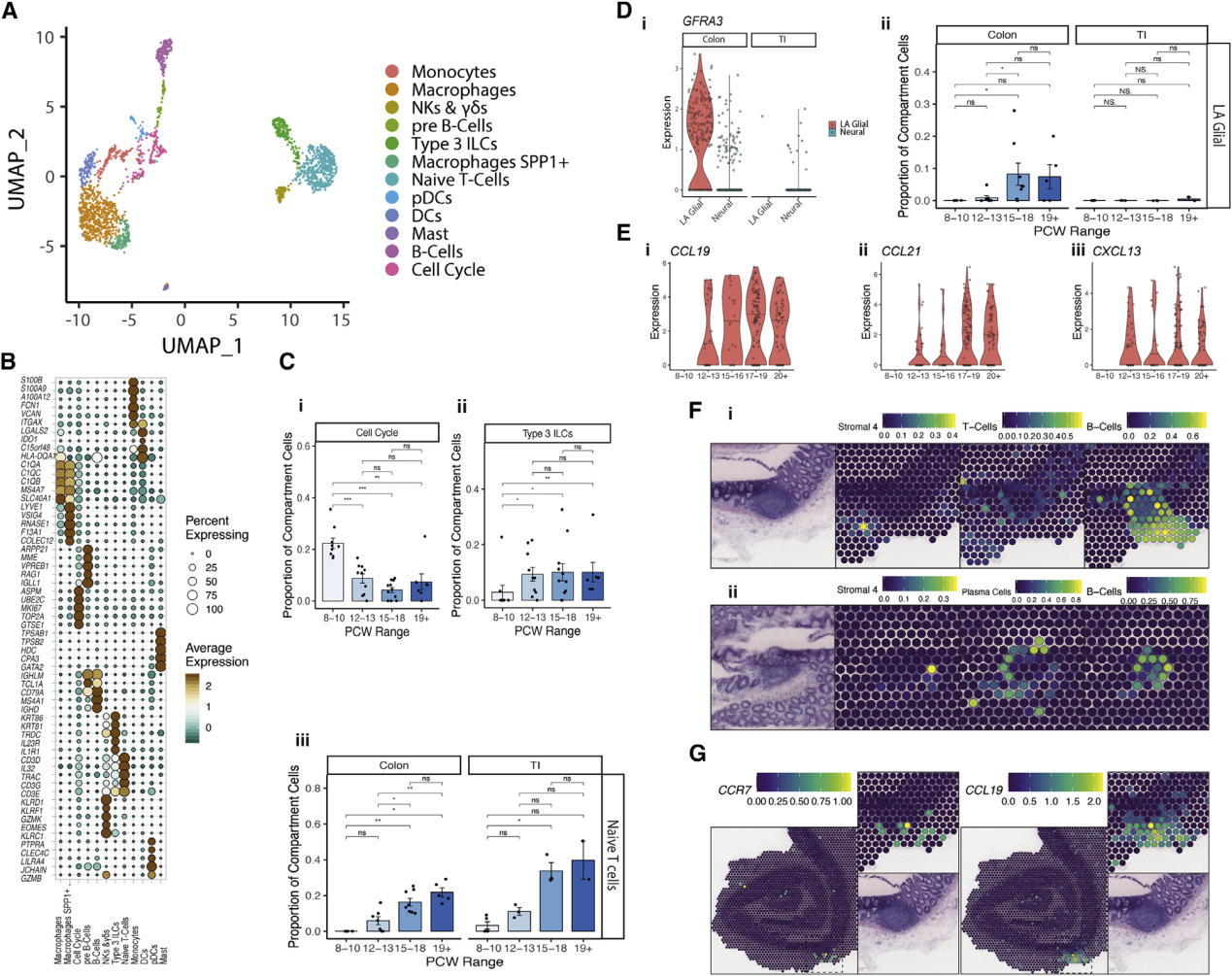 胎兒ILC3表達(dá)IL7RA和ID2(TableS1),這對小鼠子宮Peyer’s斑塊(PPs)的形成至關(guān)重要,因此將這些細(xì)胞區(qū)分為3型淋巴組織誘導(dǎo)劑(LTi)。PP的形成是一個LTi細(xì)胞、EC和基質(zhì)細(xì)胞之間相互協(xié)調(diào)作用的過程。此外,鼠類研究顯示其還需要RET/ARTN/GFRA3神經(jīng)軸,而GFRA3缺乏會導(dǎo)致PP發(fā)育受損。腸道相關(guān)淋巴樣組織(GALT)的形成被認(rèn)為在出生前以PPs的形式出現(xiàn)在SI體內(nèi),而在出生后以結(jié)腸的形式出現(xiàn)。相反,在此,研究人員確定了一個獨特的結(jié)腸而不是SI特異的神經(jīng)膠質(zhì)種群,它是發(fā)育過程中唯一的GFRA3來源,并在15 PCW時擴(kuò)展(Figure6 D),表明在人類結(jié)腸發(fā)育過程中可能存在類似的神經(jīng)免疫回路。
