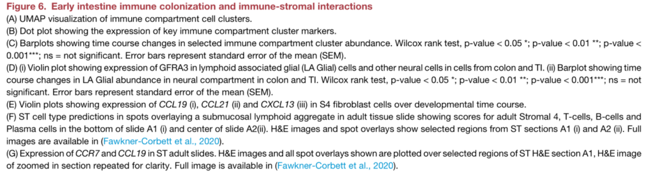 為了在空間上確認(rèn)這些相互作用,研究人員研究了成人ST,其中粘膜下淋巴濾泡被視為獨特的結(jié)構(gòu)。S4和免疫細(xì)胞(例如CD3和CD19)的關(guān)鍵標(biāo)記基因在這些卵泡中和周圍表達(dá),因子分析證實了各種成年免疫細(xì)胞(B細(xì)胞,T細(xì)胞和髓樣細(xì)胞)和此處定位的S4細(xì)胞類型(Figure6) F)。研究人員還發(fā)現(xiàn)ST中關(guān)鍵RL對的顯著共定位(包括CCR7 / CC19(1個點內(nèi)p = 1.098×10 -10,半徑內(nèi)p = 5.59×10 -49)(Figure6G)。表明S4細(xì)胞是成年結(jié)腸中與卵泡相鄰的成纖維細(xì)胞,在胎兒GALT發(fā)育過程中以時間依賴性方式出現(xiàn)。