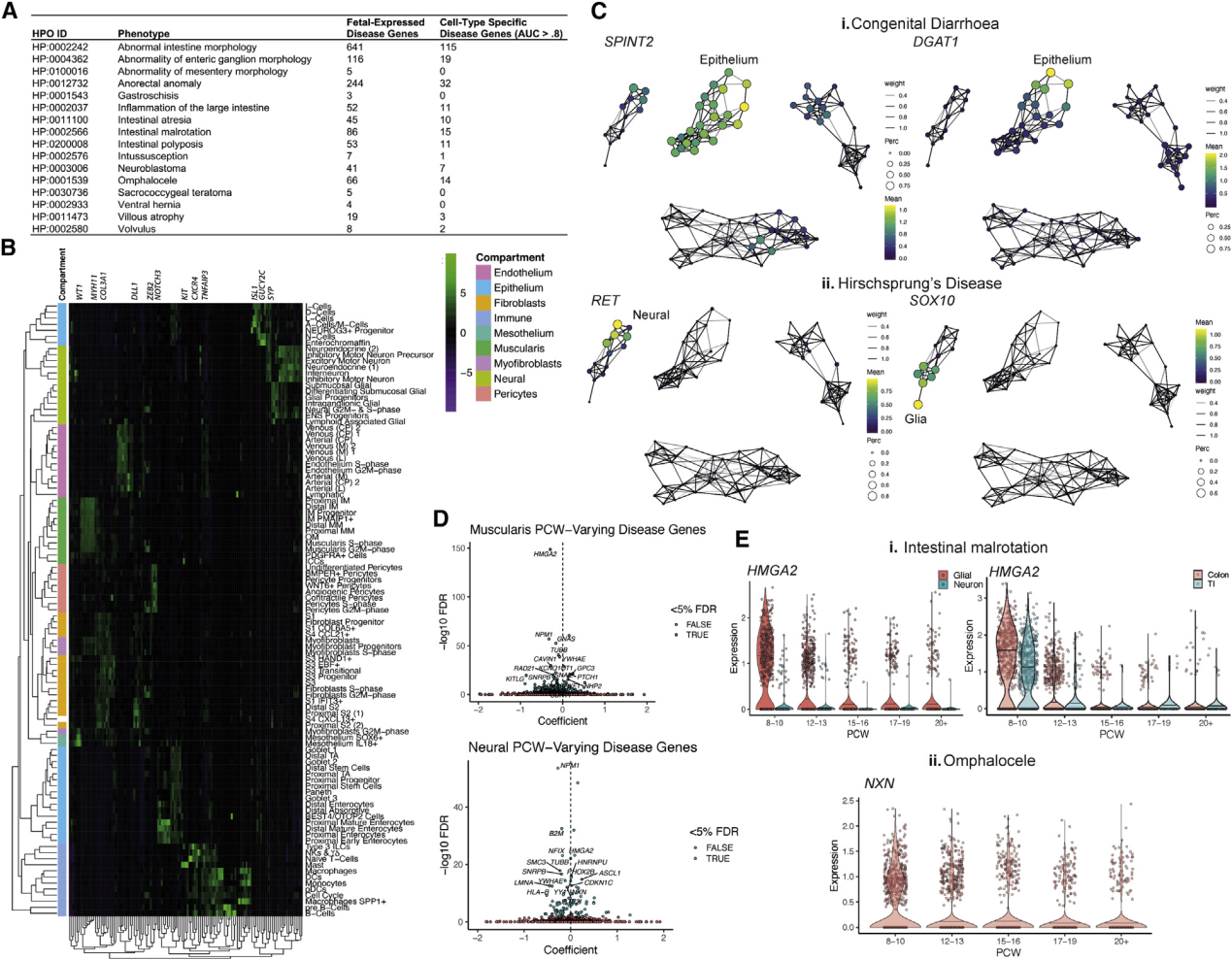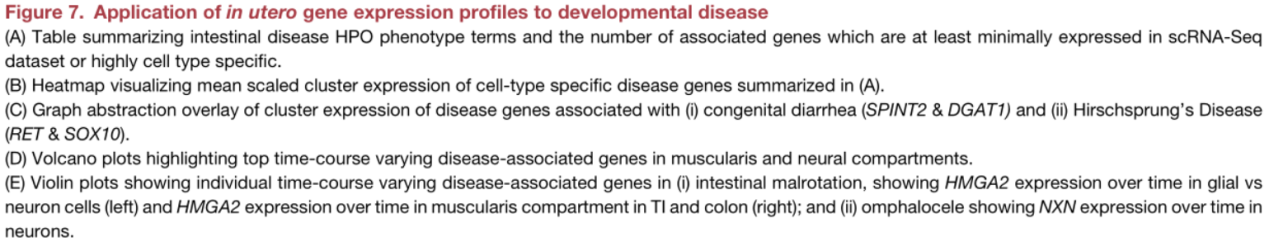 該研究在時間方面允許研究隨著發(fā)育時間而變化的疾病基因(Figure7D),并可以提供與時間相關(guān)的信息,突出顯示PCW前12膠質(zhì)細(xì)胞和IM祖細(xì)胞表達(dá)的基因HMGA2(分別為FDR<2.2e-16)(Figure7Ei),與腸道旋轉(zhuǎn)不良有關(guān)(12q14微缺失綜合癥,ORPHA:94063)。同樣,早期抑制運動神經(jīng)元特異的NXN的致病變體(Figure7Eii)會導(dǎo)致卵泡擴(kuò)張(Robinow綜合征,OMIM:618529)。在此發(fā)育時期,腸子回到了腹部,表明ENS細(xì)胞和肌肉祖細(xì)胞可能對該過程至關(guān)重要。