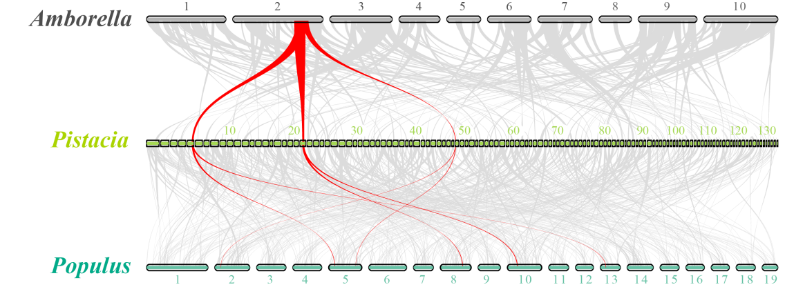 如2019年百邁客合作發表于《Genome Biology》開心果基因組文章事例所示:每個無油樟區域對應三個開心果區域,每個開心果區域對應有兩個毛果楊區域,暗示了開心果在毛果楊之外又發生了一次獨立的復制事件。