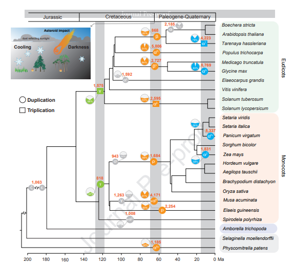 多倍化(polyploidy)或全基因組加倍(whole genome duplication, WGD)事件使基因組內的所有基因都發生重復,為生物進化提供了原始的遺傳材料,被認為是進化的加速器。全基因組復制事件在真菌或動植物中都有發生,是基因組中基因數量變化、基因新功能的形成、基因重排等的重要推動力。