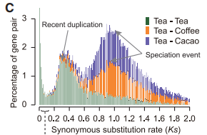KS:全基因組加倍事件會產生大量的同源基因,反映在Ks值上便是會有大量的Ks值接近的同源基因對的產生,Ks值峰就對應了全基因組加倍事件的存在。